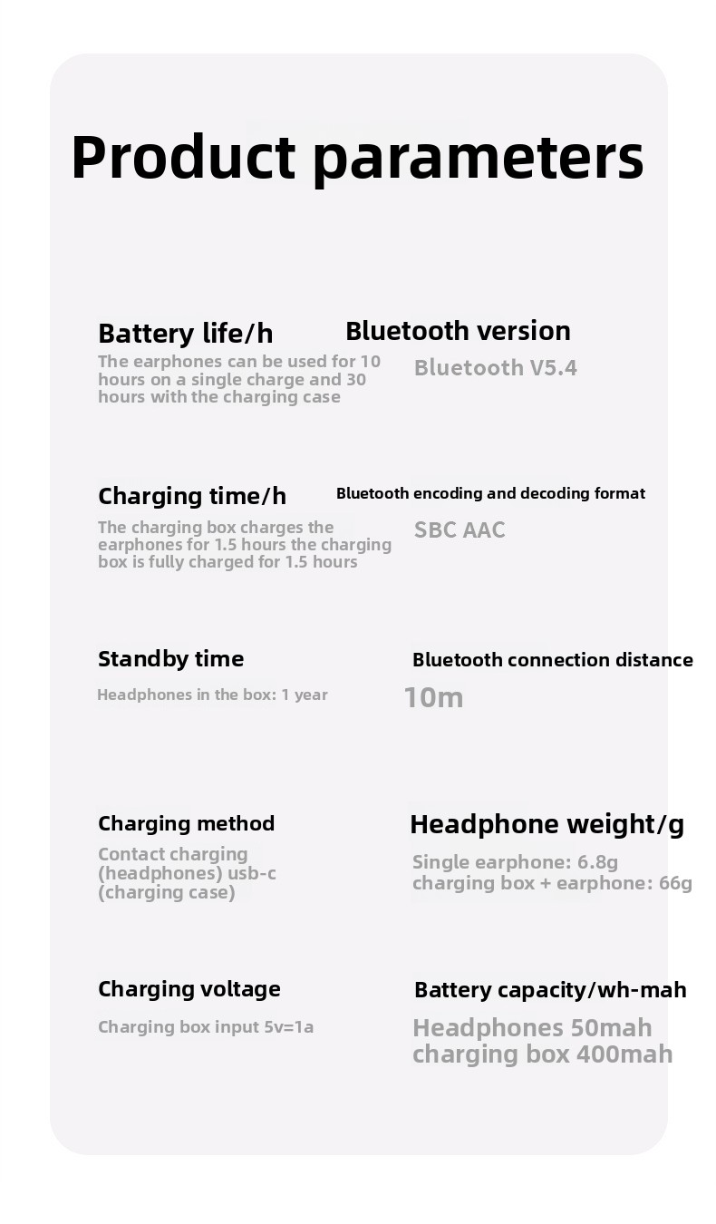 Packing ListBluetooth headset1Charging case1USB cable1User manual1