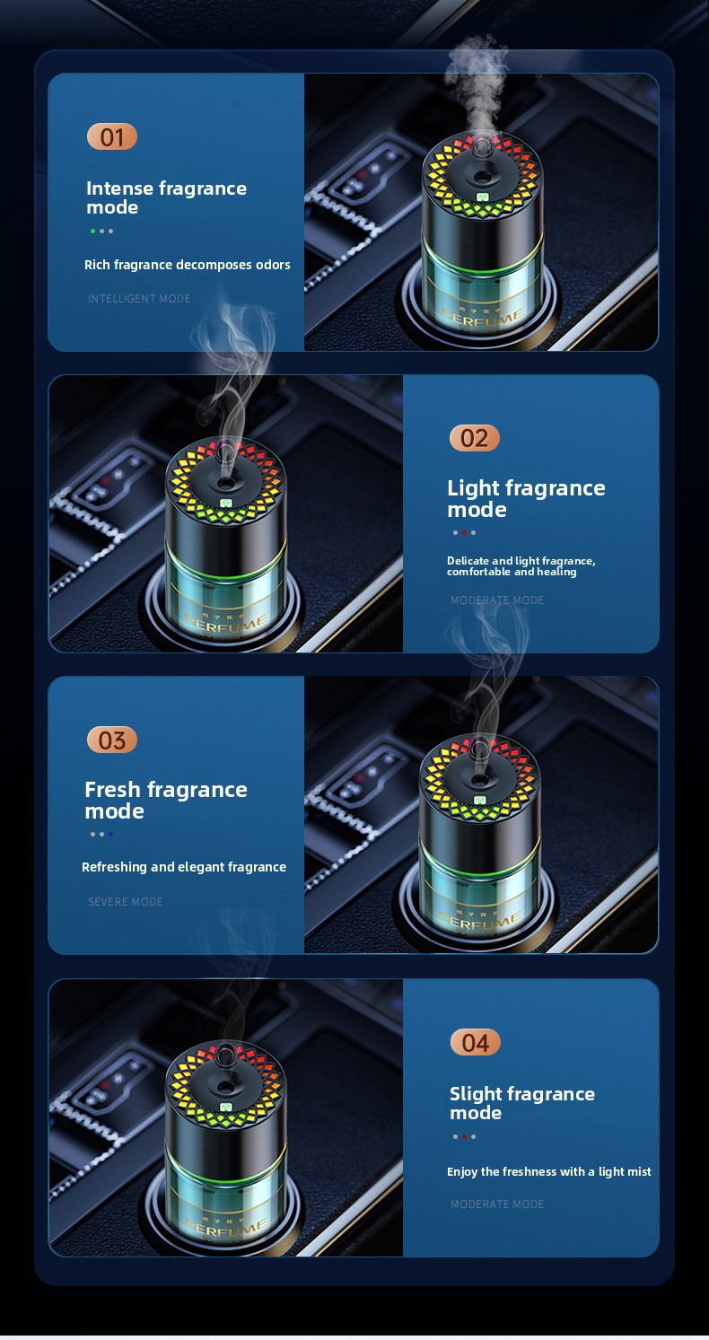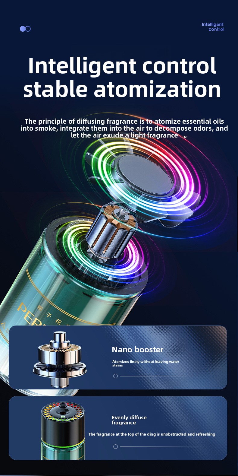Smart Nano Spray: Utilizes advanced nano technology for fine mist diffusion, ensuring even fragrance distribution.