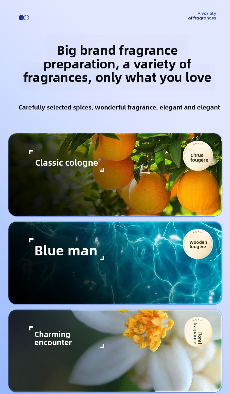 Fragrance Types: Floral (gardenia, water lily), classic cologne, blue ocean, etc.