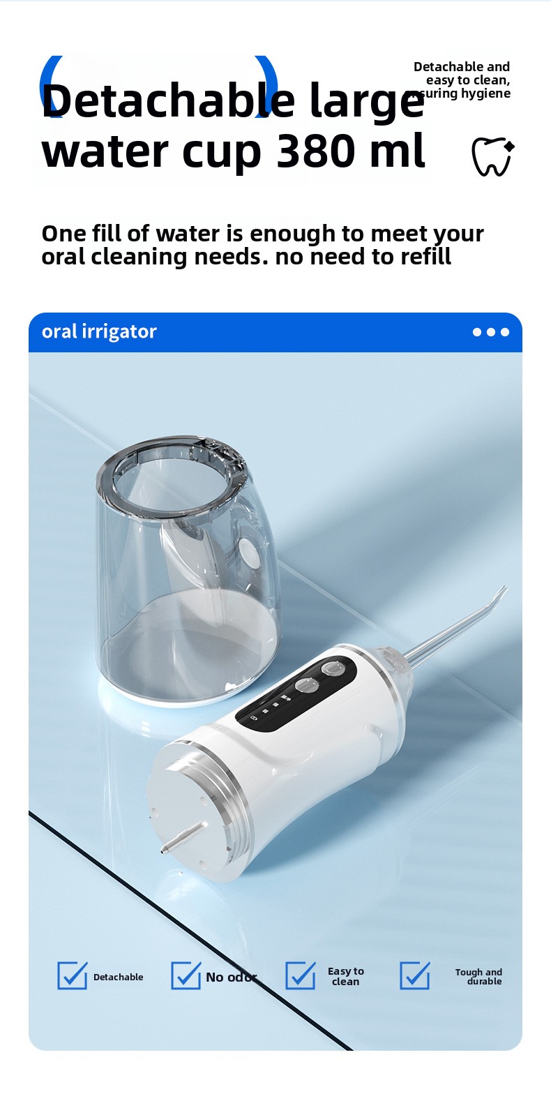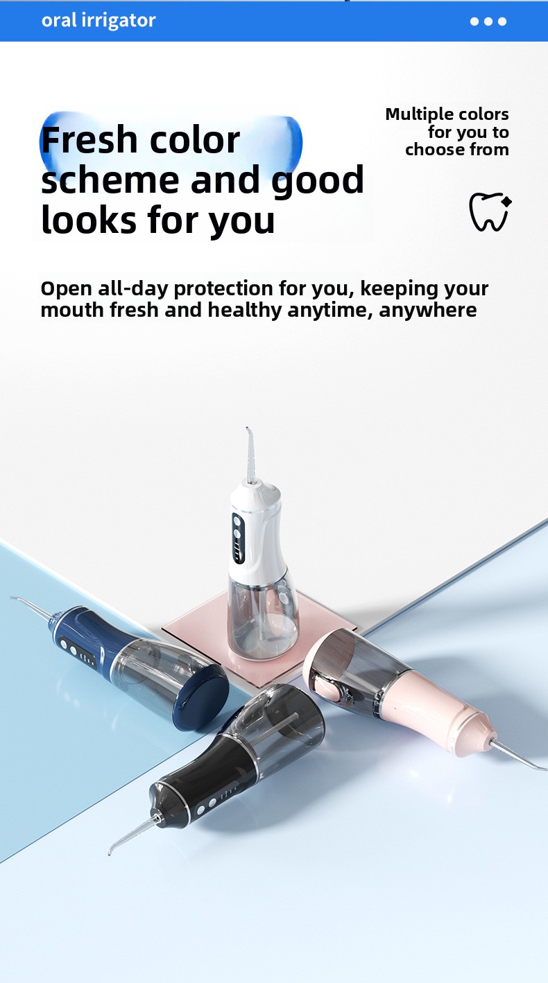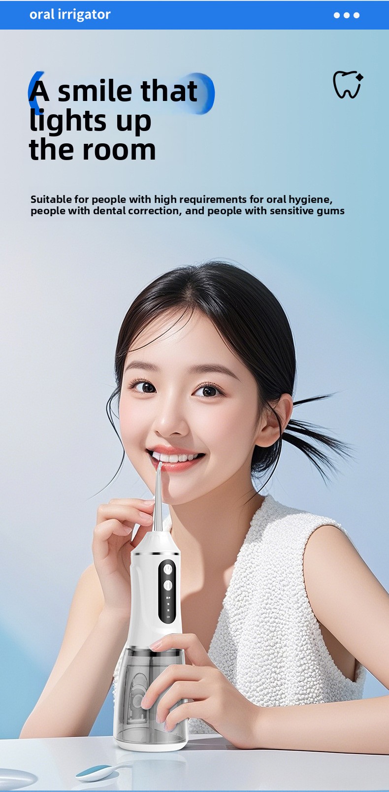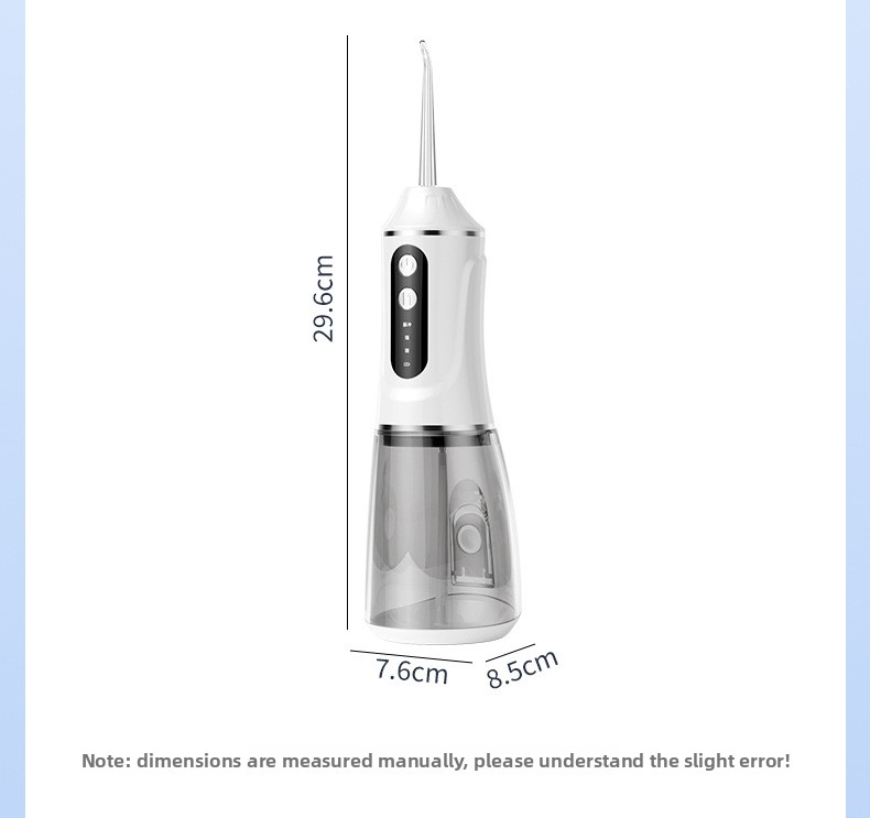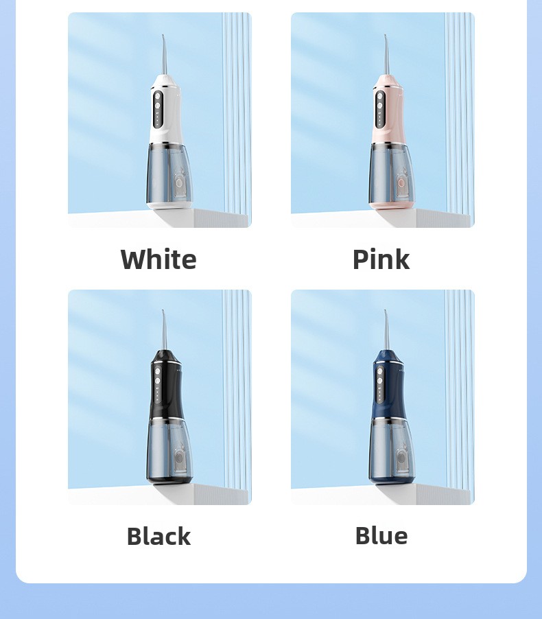 Overview Portable Design: Compact and lightweight for easy carrying and travel use Electric Cleaning: Efficient motor-driven water pulsation for thorough oral hygiene High Capacity: 300-400ml water tank reduces refill frequency during use IPX7 Waterproof: Fully submersible protection ensures safe operation Multiple Nozzles: Interchangeable tips for customized cleaning experience