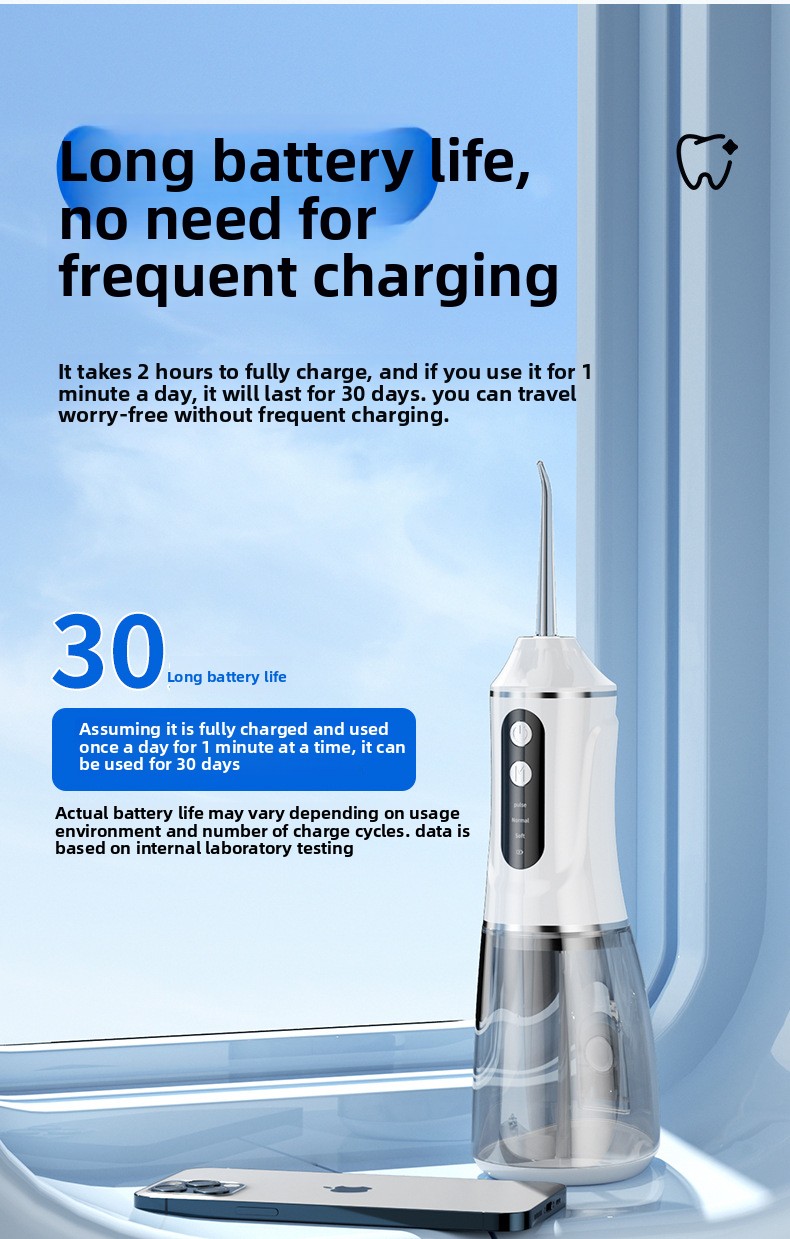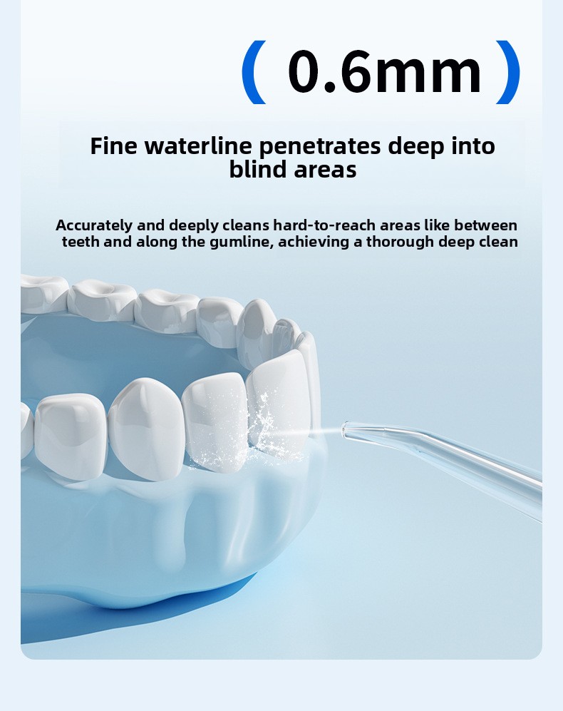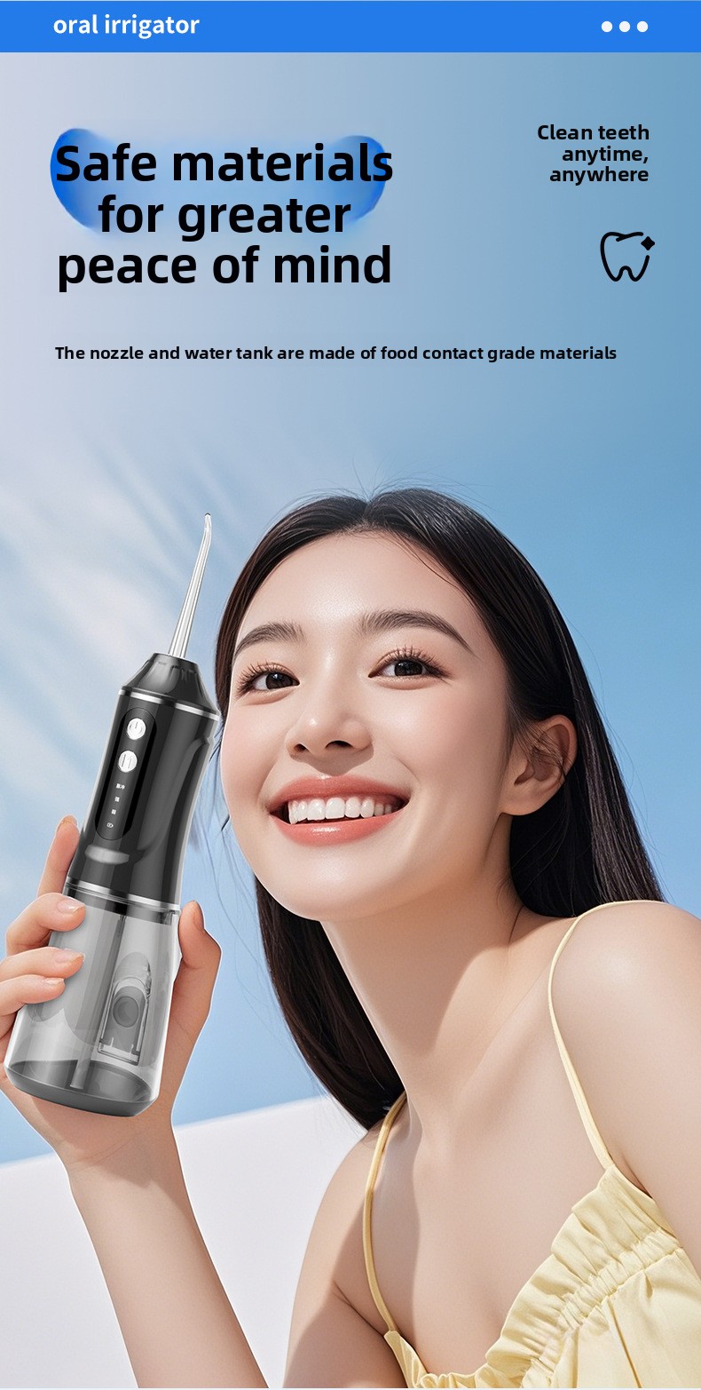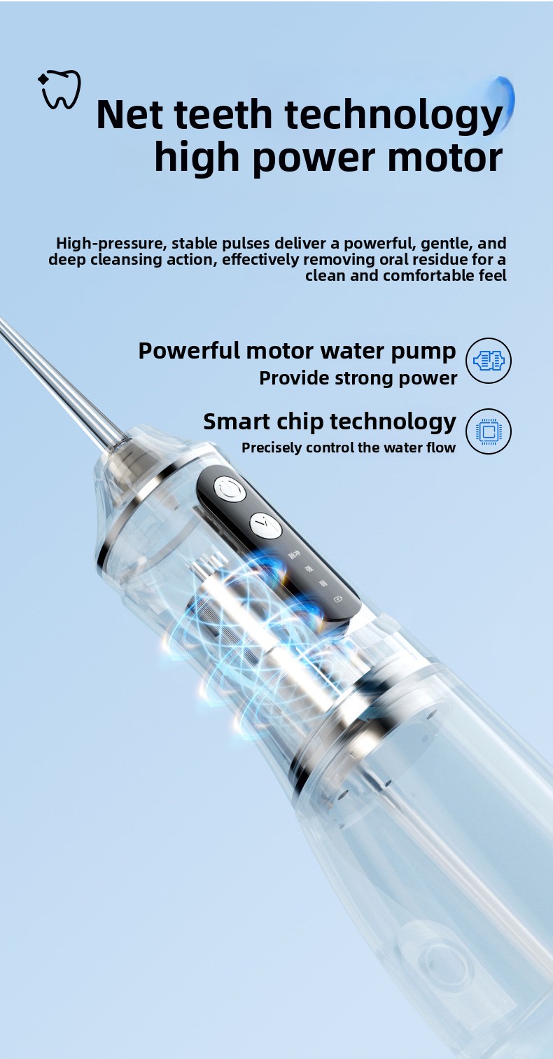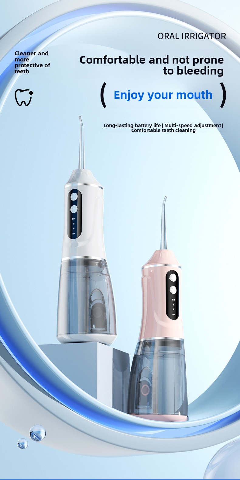 Overview Portable Design: Compact and lightweight for easy carrying and travel use Electric Cleaning: Efficient motor-driven water pulsation for thorough oral hygiene High Capacity: 300-400ml water tank reduces refill frequency during use IPX7 Waterproof: Fully submersible protection ensures safe operation Multiple Nozzles: Interchangeable tips for customized cleaning experience