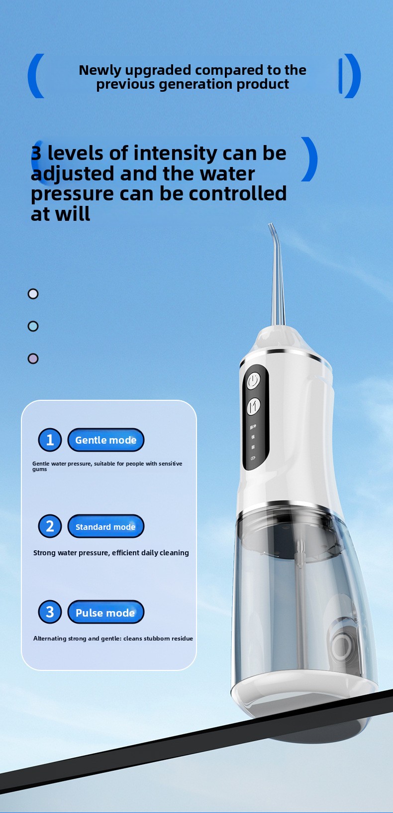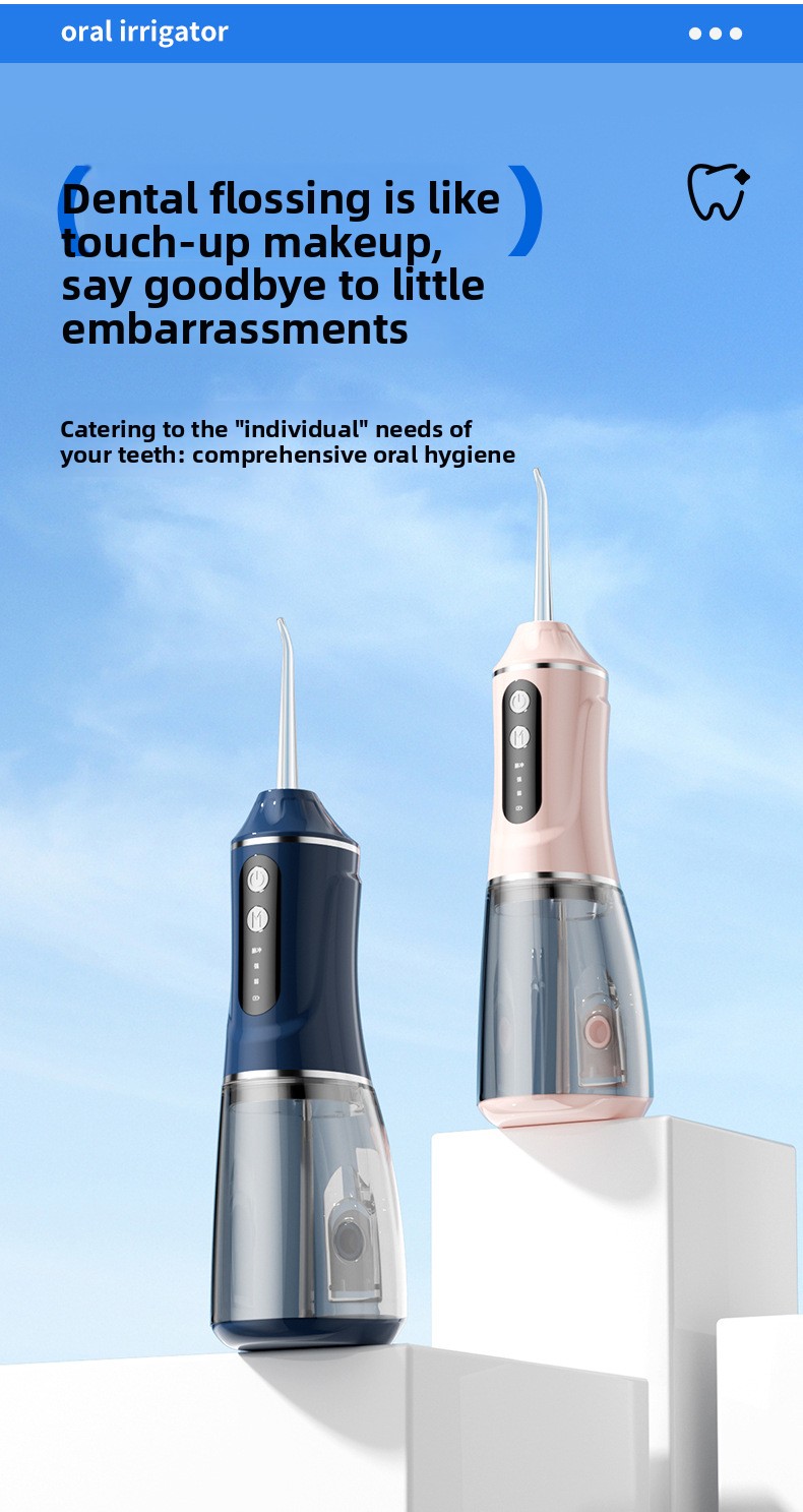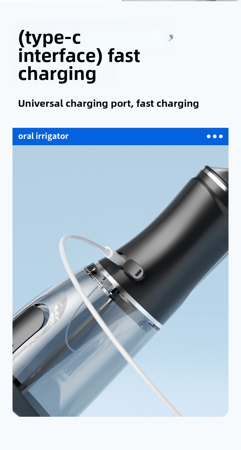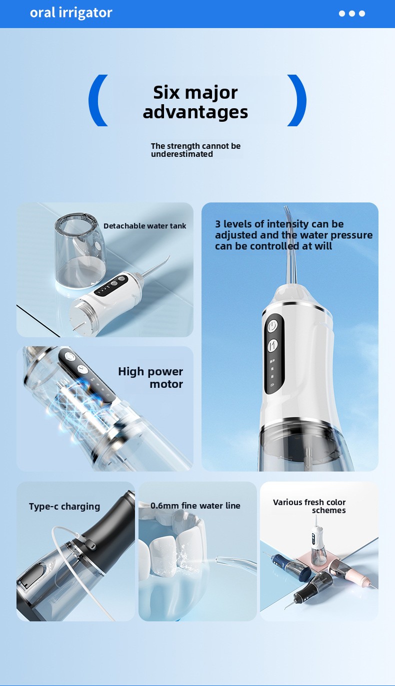 Overview Portable Design: Compact and lightweight for easy carrying and travel use Electric Cleaning: Efficient motor-driven water pulsation for thorough oral hygiene High Capacity: 300-400ml water tank reduces refill frequency during use IPX7 Waterproof: Fully submersible protection ensures safe operation Multiple Nozzles: Interchangeable tips for customized cleaning experience