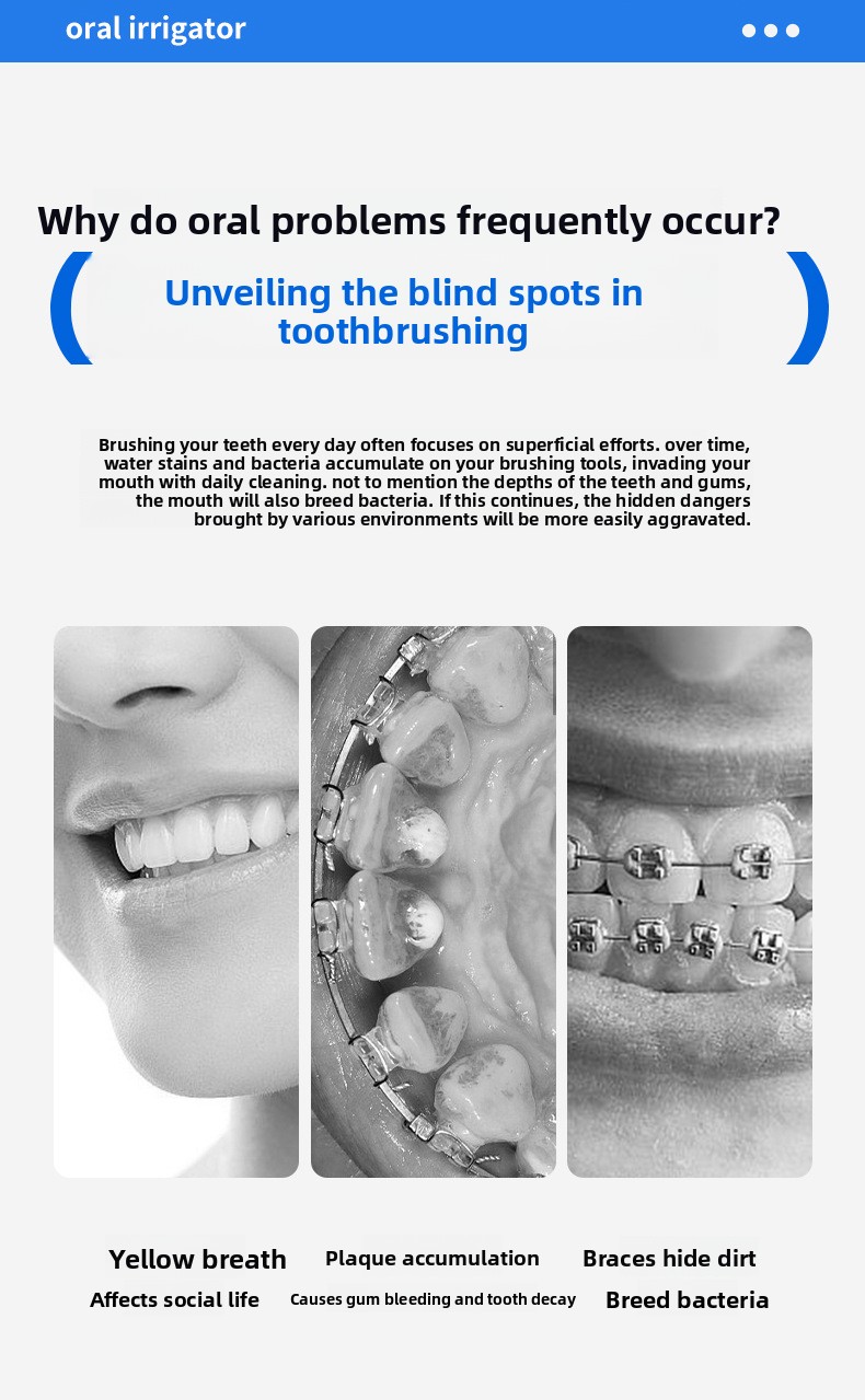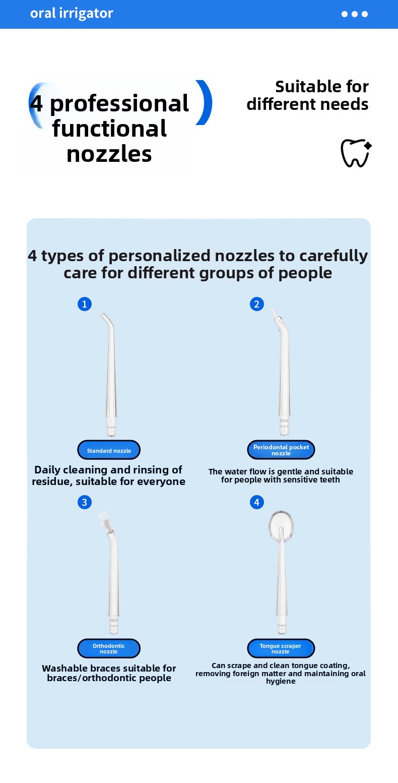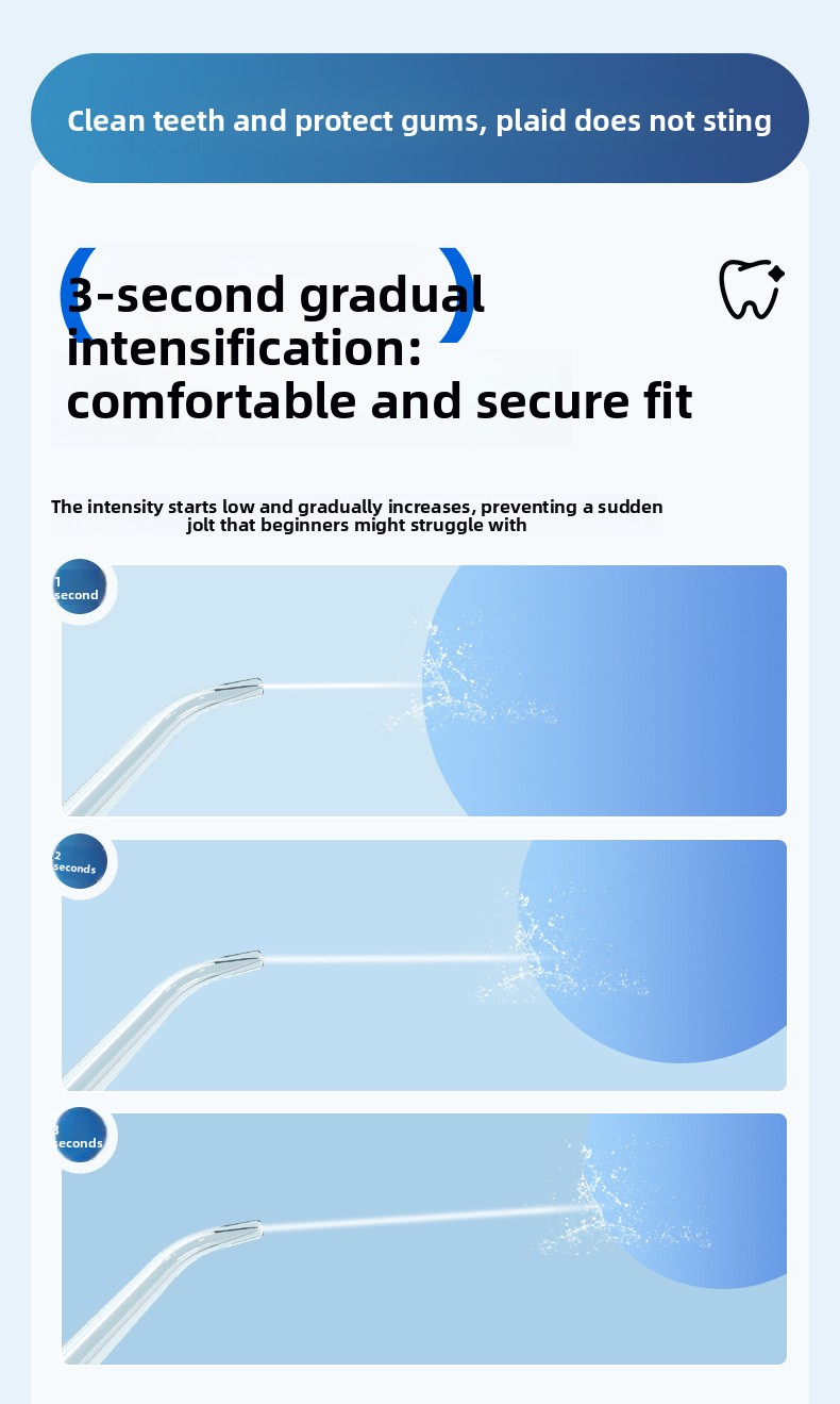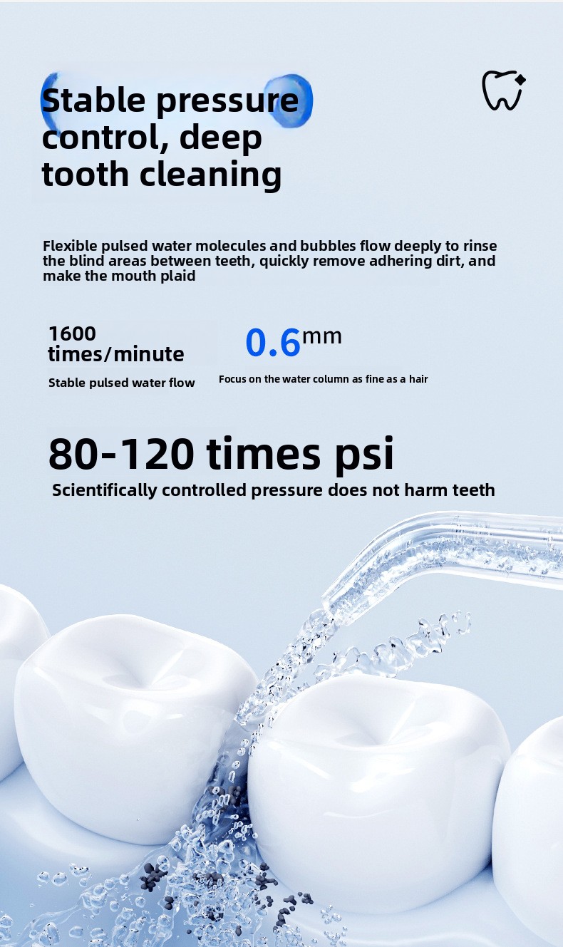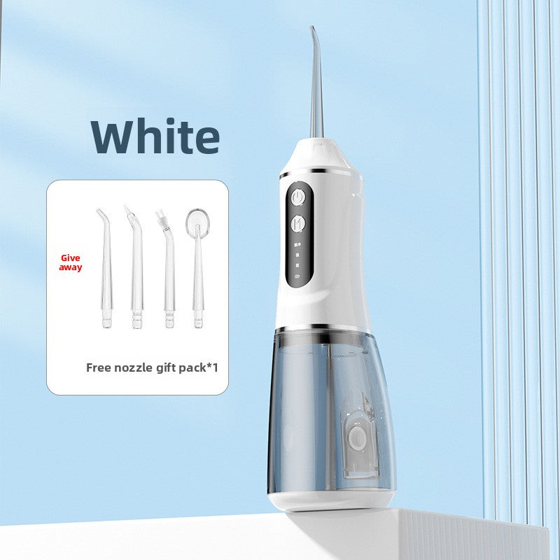 Overview Portable Design: Compact and lightweight for easy carrying and travel use Electric Cleaning: Efficient motor-driven water pulsation for thorough oral hygiene High Capacity: 300-400ml water tank reduces refill frequency during use IPX7 Waterproof: Fully submersible protection ensures safe operation Multiple Nozzles: Interchangeable tips for customized cleaning experience