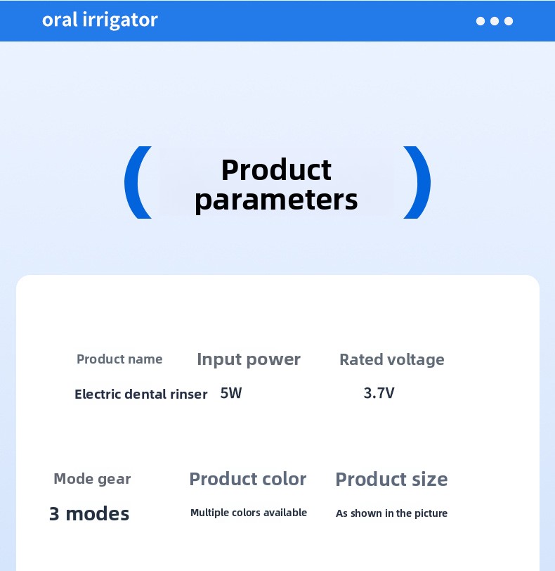 Specifications Product Type: Electric dental irrigator Pump Type: Piston pump Water Tank Capacity: 300-400ml Waterproof Rating: IPX7 Power Source: Built-in battery Suitable For: Adults Available Colors: Blue, Black, White, Pink