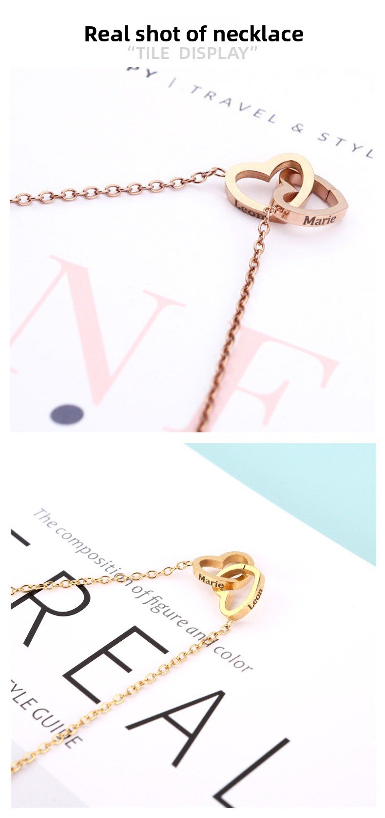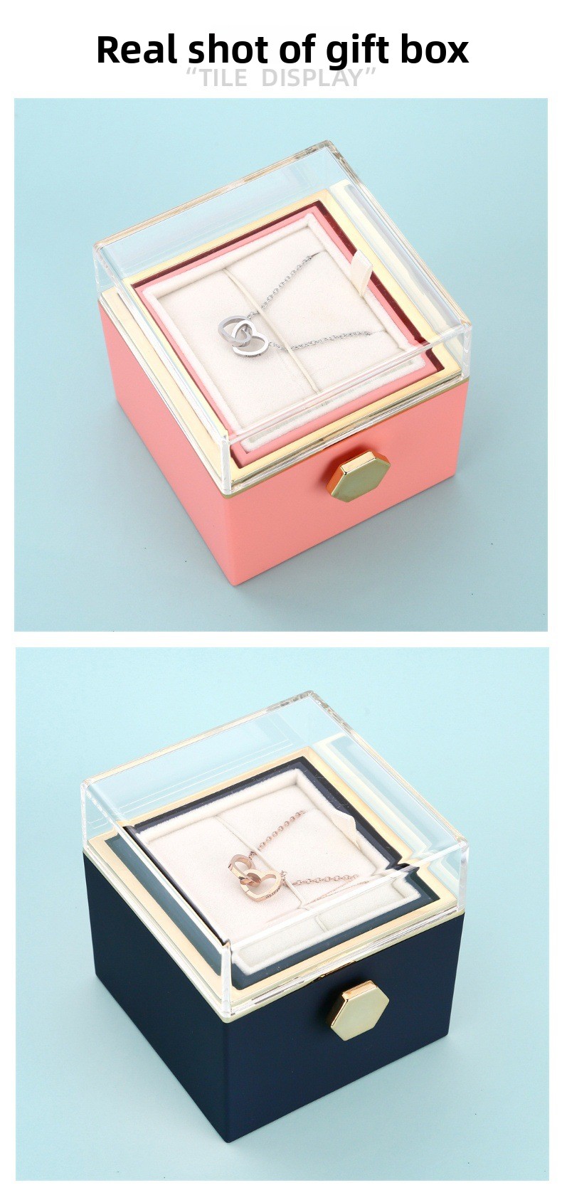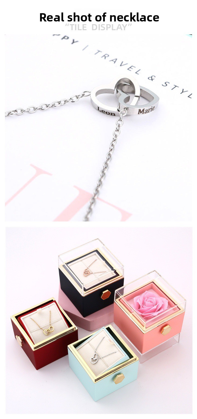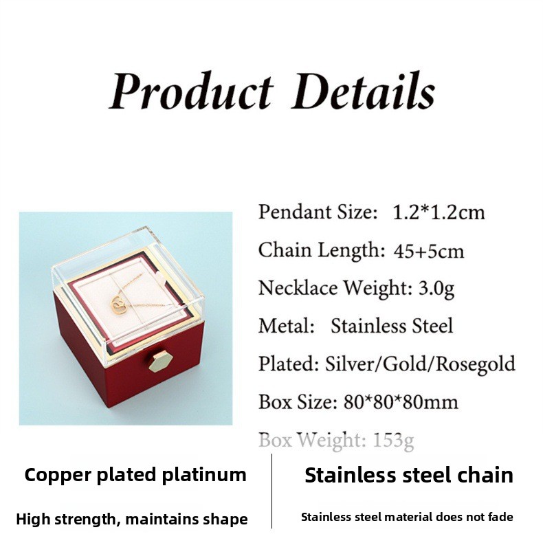 Color Options: Steel, gold, rose gold (necklaces); red, pink, light blue, dark blue, white (boxes with handbags); silver, gold (bracelets)